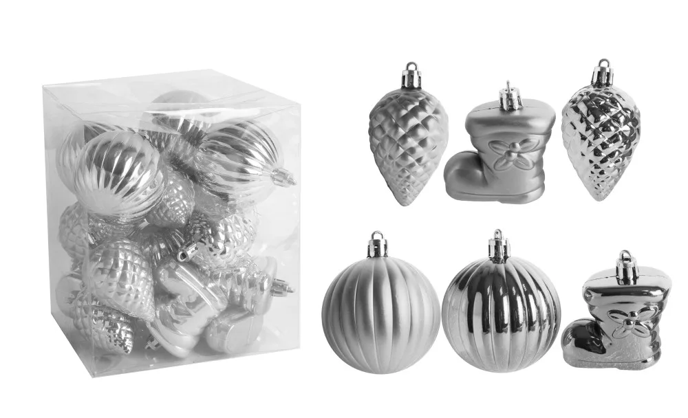 KARÁCSONYI DÍSZ, VEGYESDÍSZ, SZETTBEN, PVC DOBOZBAN, 18DARABOS, EZÜST