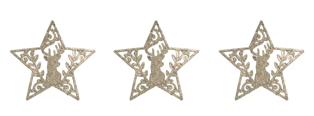 AKASZTÓS KARÁCSONYI DÍSZ CSILLAG SZETT, 3 DARABOS, RÉNSZARVAS MINTÁS, ARANY
