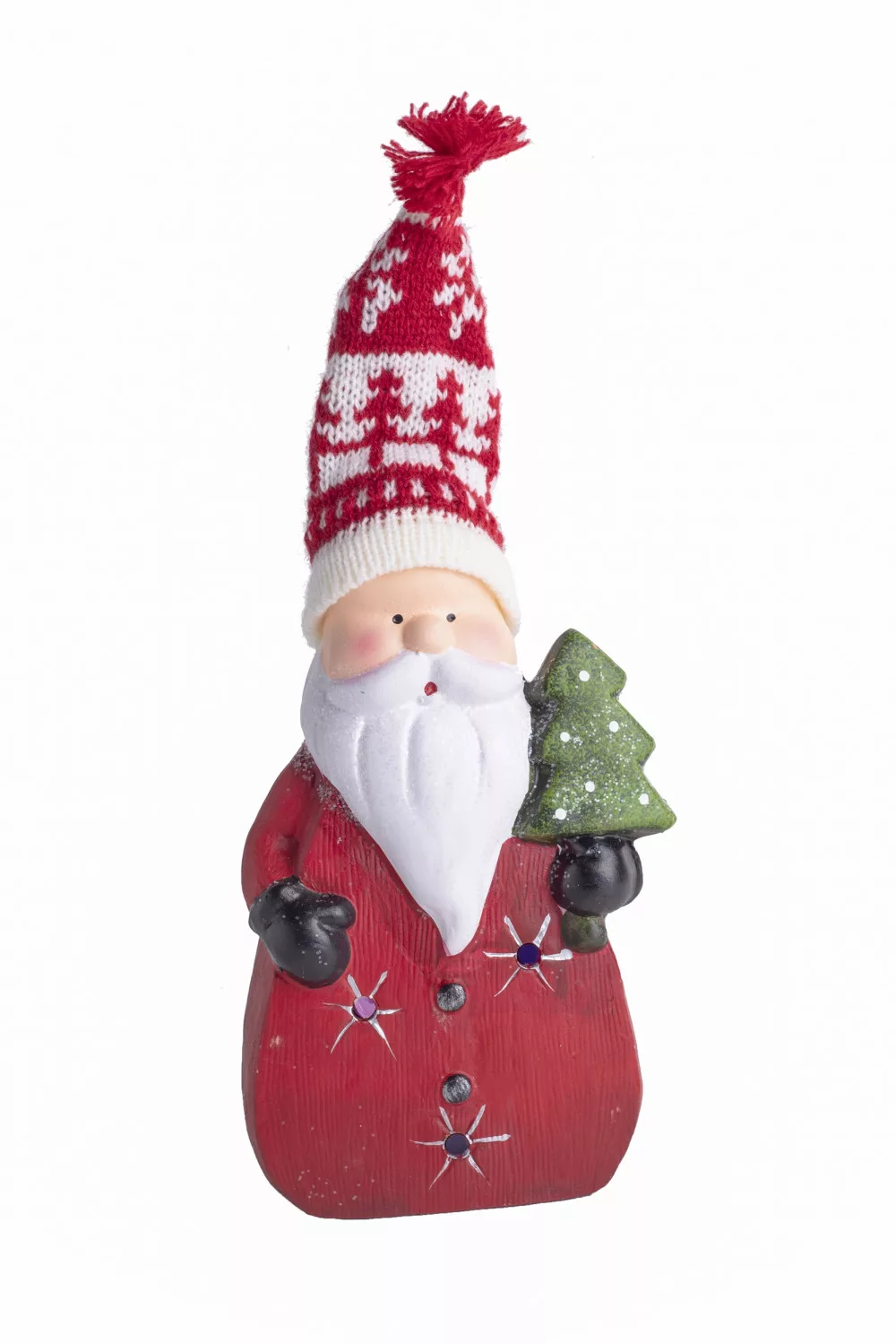 KERÁMIA VILÁGÍTÓ RÉNSZARVAS VAGY TÉLAPÓ, LEDDEL, KÖTÖTT SAPKÁVAL, PIROS