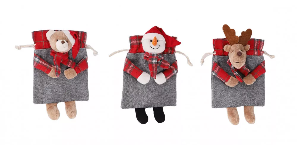 TEXTIL MIKULÁSZSÁK FEJEKKEL, MEDVÉS VAGY HÓEMBERES VAGY RÉNSZARVASOS
