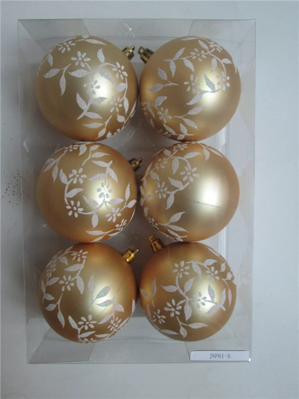KARÁCSONYI DÍSZ GÖMB SZETT PVC DOBOZBAN, 6 DARABOS, ARANY MATT VIRÁG MINTÁS