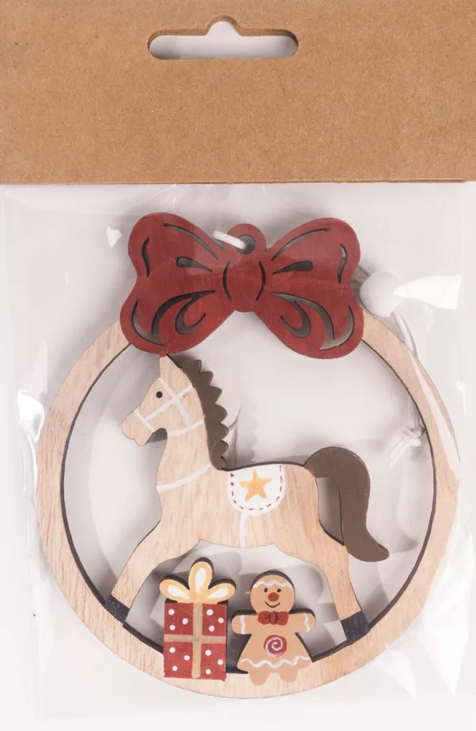 FA AKASZTÓS GÖMBDÍSZ, HINTALÓVAL, AJÁNDÉKKAL, NATÚR ÉS PIROS