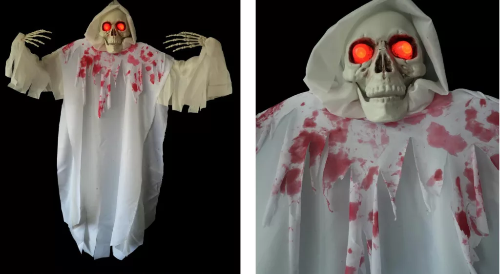 HALLOWEENI FÜGGŐ DEKORÁCIÓ, CSONTVÁZ, VÉRES, HANGGAL, VILÁGÍTÁSSAL, FEHÉR