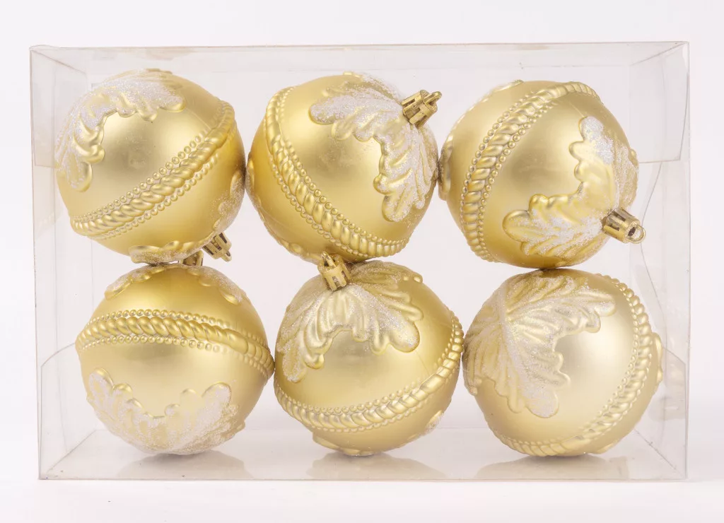 KARÁCSONYI DÍSZ GÖMB LEVÉL MINTÁS, SZETTBEN, PVC DOBOZBAN, 6 DARABOS, PEZSGŐ ARANY
