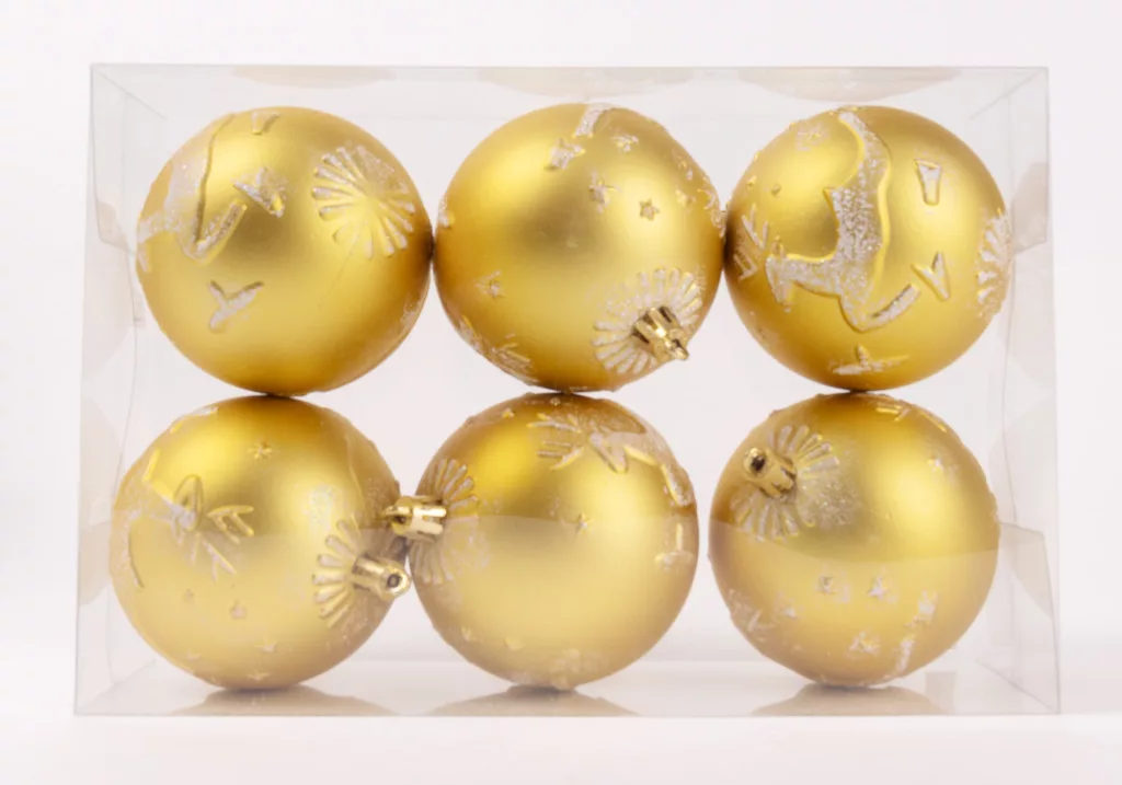 KARÁCSONYI DÍSZ GÖMB SZARVAS MINTÁS, SZETTBEN, PVC DOBOZBAN, 6 DARABOS, ARANY