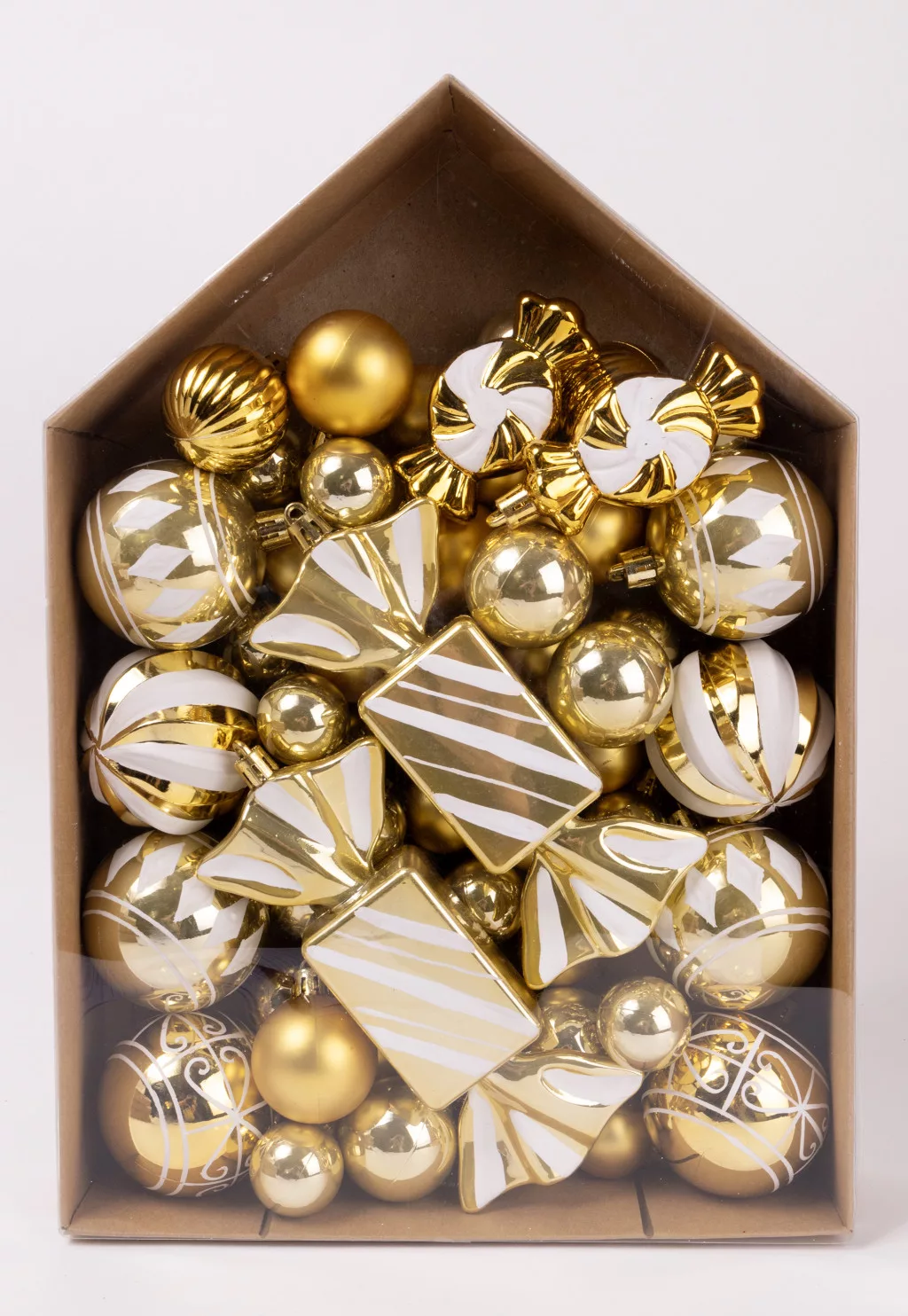 KARÁCSONYI DÍSZ MIX, SZETTBEN, 58 DARABOS, ARANY ÉS FEHÉR