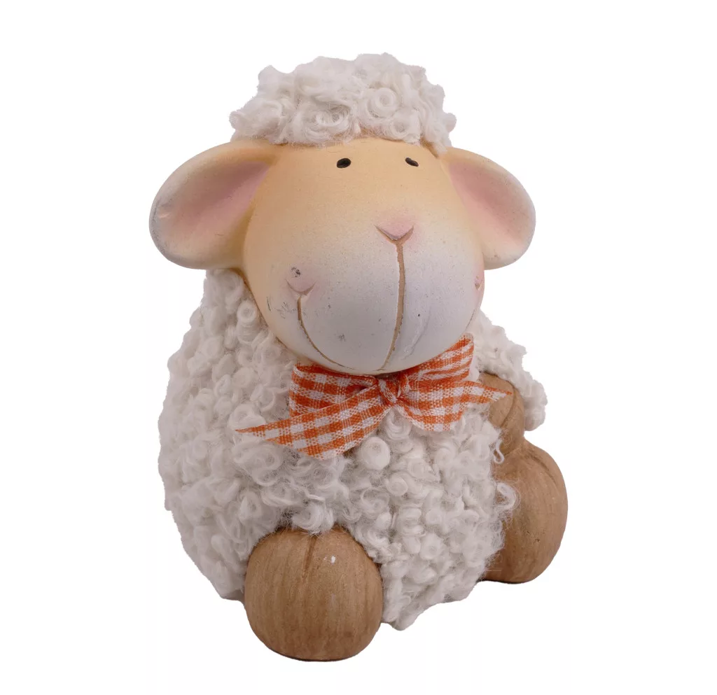 KERÁMIA BÁRÁNY, ÜLŐ, NARANCSSÁRGA KOCKÁS SZALAGGAL, FEHÉR