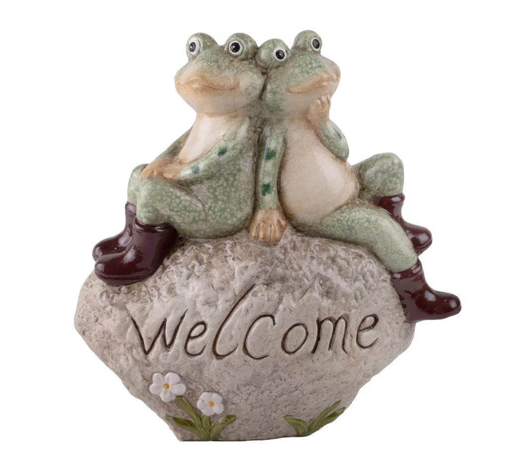 KERÁMIA BÉKÁK, GUMICSIZMÁBAN, KÖVÖN, WELCOME FELIRATTAL, ZÖLD