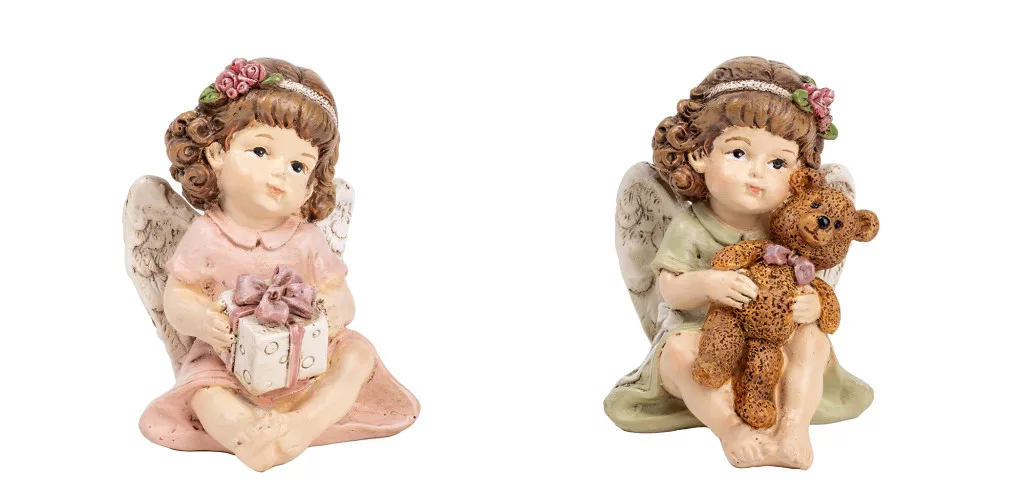 POLIREZIN ANGYAL, AJÁNDÉK DOBOZZAL, MEDVÉVEL, RÓZSASZÍN ZÖLD