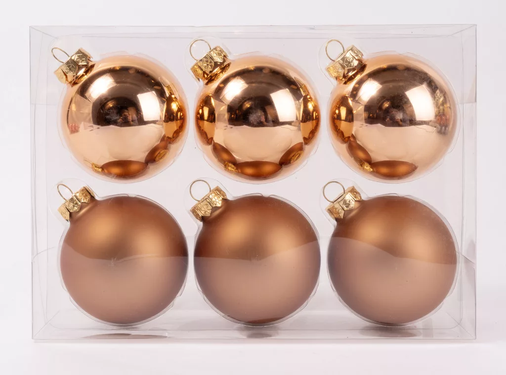 ÜVEG KARÁCSONYI DÍSZ GÖMB SZETT PVC DOBOZBAN, 6 DARABOS, BRONZ