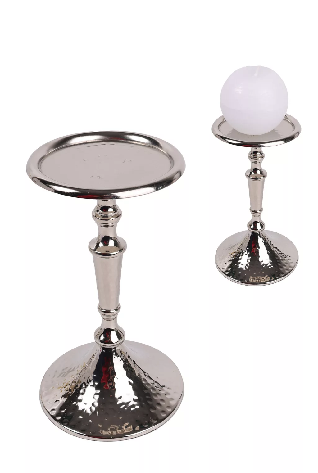 ALUMÍNIUM GYERTYATARTÓ, TALPAS, KALAPÁLT, FÉNYES EZÜST