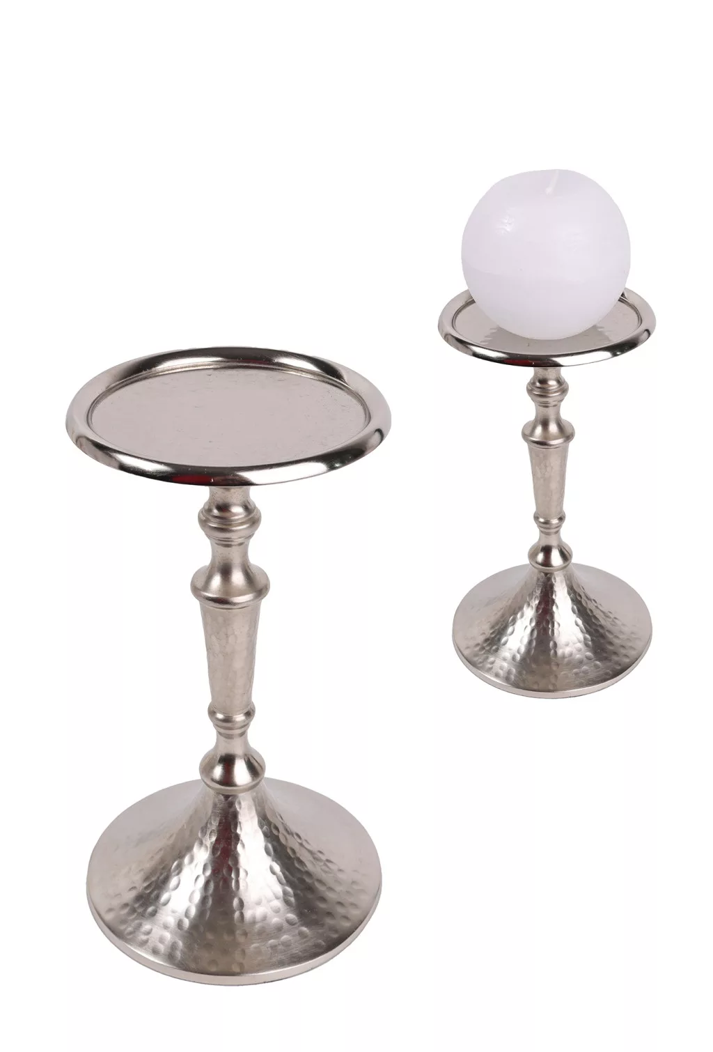 ALUMÍNIUM GYERTYATARTÓ, TALPAS, KALAPÁLT, MATT EZÜST