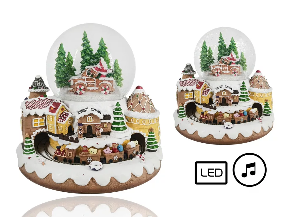 POLIREZIN HAVAZÓ GÖMB, LEDDEL ÉS ZENÉVEL, MOZGÓ VONAT, HAVAS HÁZAK