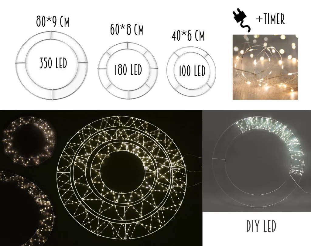 VILÁGÍTÓ DRÓT KOSZORÚ LEDDEL, 3-AS SZETT, LAPOS