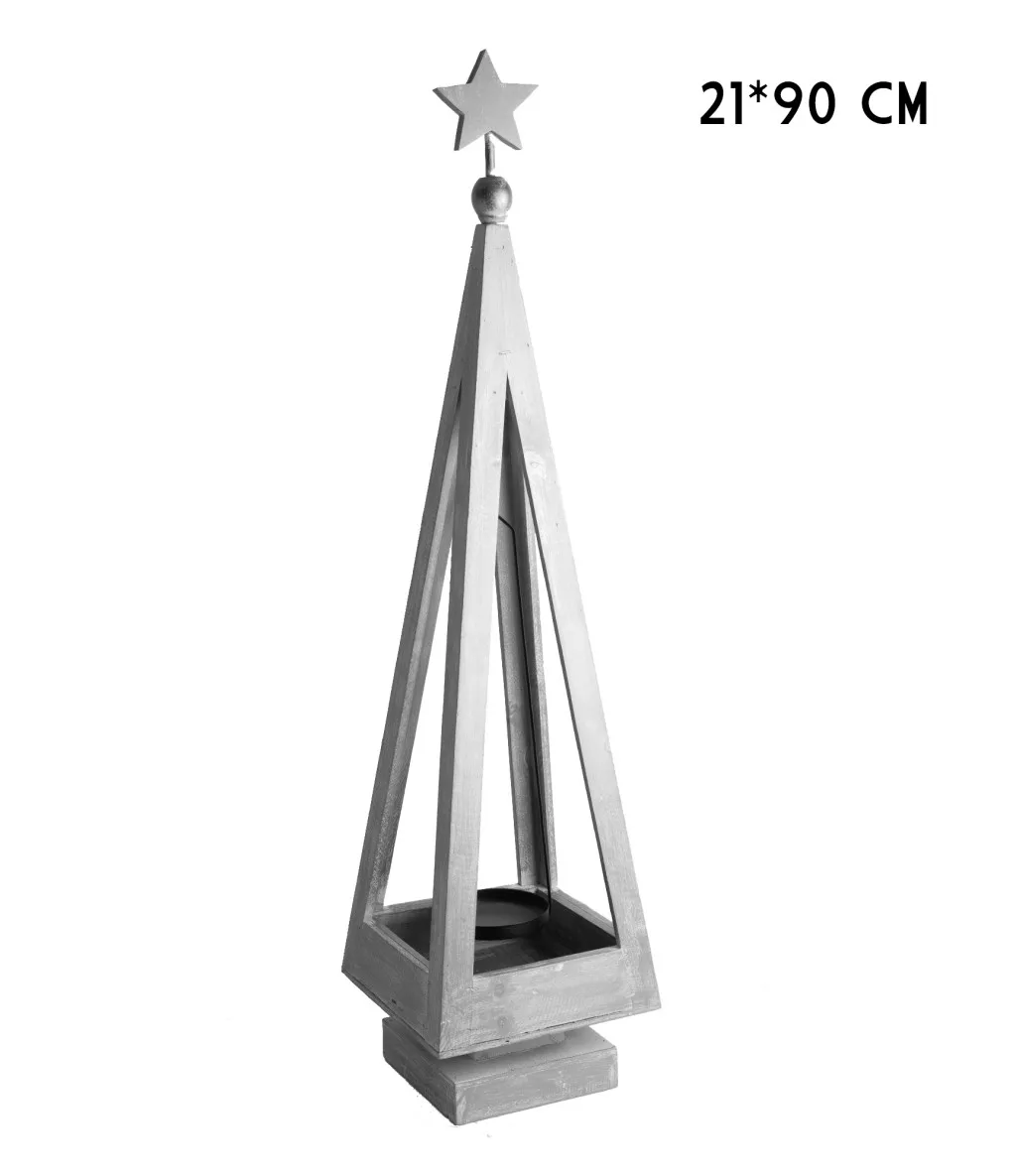 FA ÉS FÉM GYERTYATARTÓ PIRAMIS ALAKÚ, CSILLAGGAL A TETEJÉN, SZÜRKE