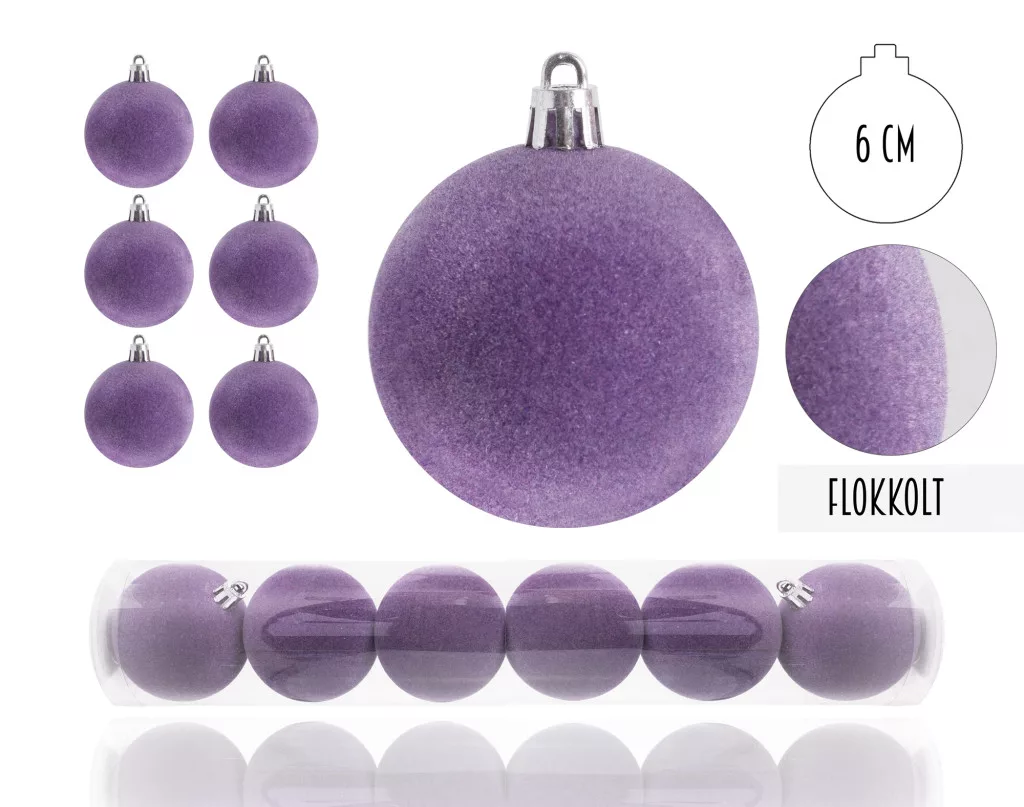 KARÁCSONYI DÍSZ GÖMB, SZETTBEN, PVC DOBOZBAN, FLOKKOLT, 6 DARABOS, LILA