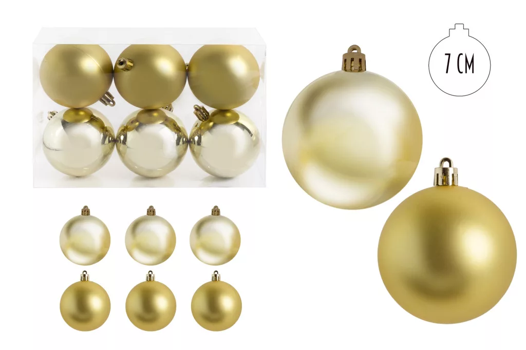 KARÁCSONYI DÍSZ GÖMB, SZETTBEN, PVC DOBOZBAN, 6DBOS, ARANYSÁRGA