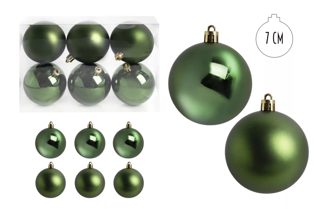 KARÁCSONYI DÍSZ GÖMB, SZETTBEN, PVC DOBOZBAN, 6DBOS, SÖTÉTZÖLD