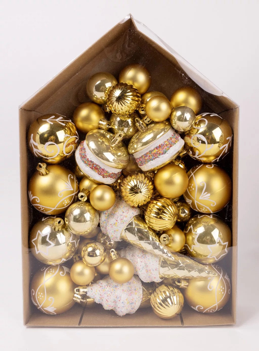 KARÁCSONYI DÍSZ MIX, SZETTBEN, 58 DARABOS, ARANY ÉS FEHÉR