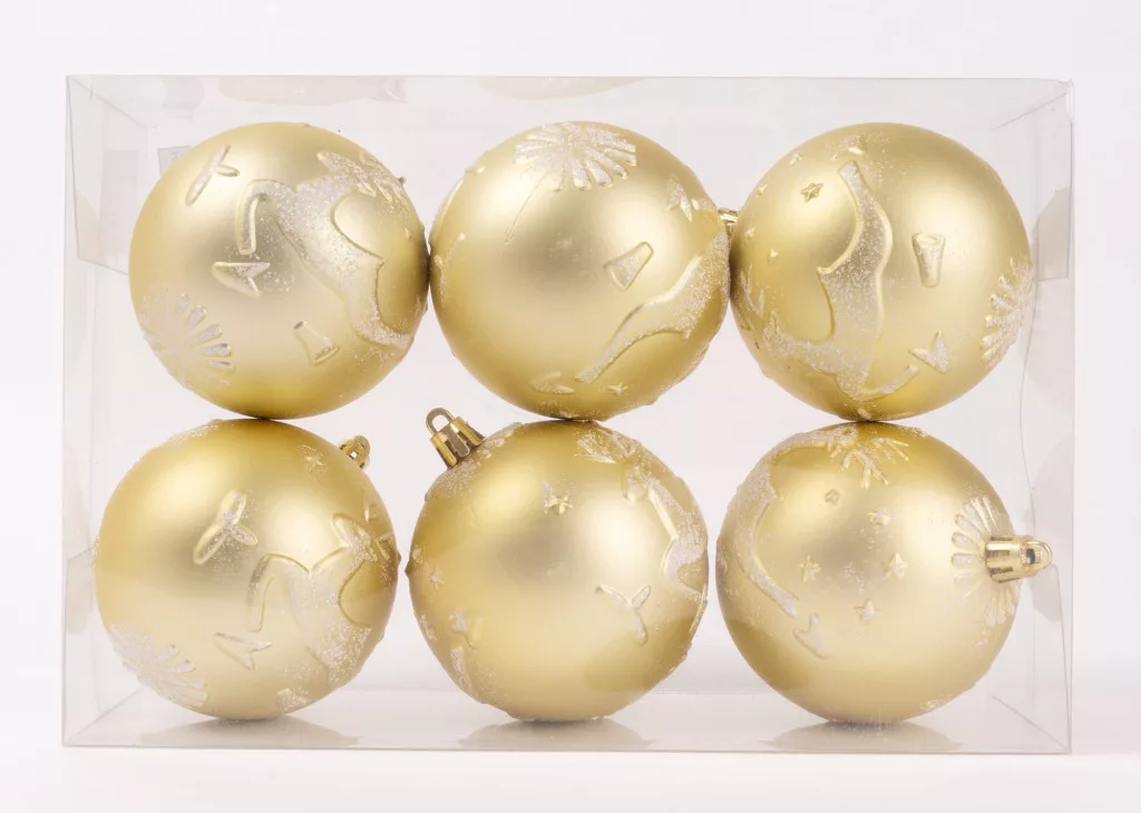 KARÁCSONYI DÍSZ GÖMB SZARVAS MINTÁS, SZETTBEN, PVC DOBOZBAN, 6 DARABOS, PEZSGŐ ARANY
