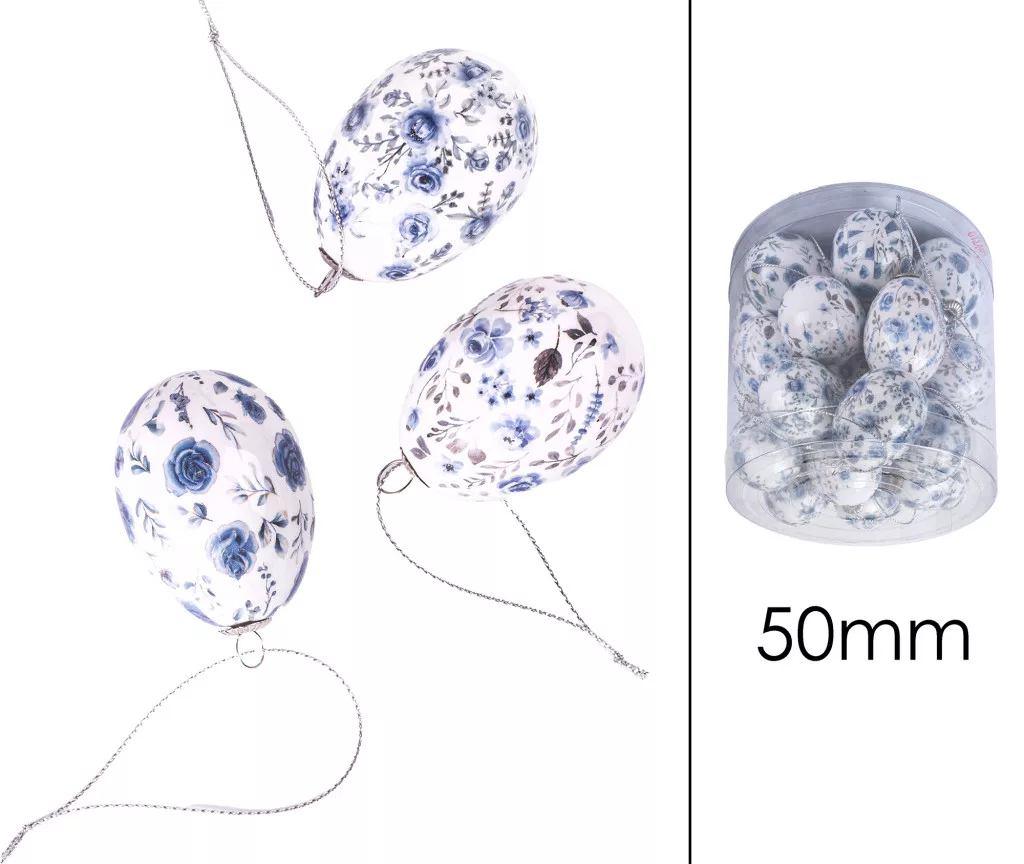 MŰANYAG AKASZTÓS TOJÁS SZETTBEN, 24 DARABOS, PLEXI DOBOZBAN, VIRÁGOS, KÉK ÉS FEHÉR