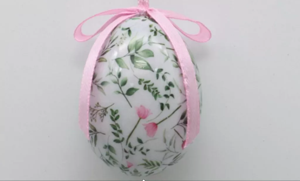 MŰANYAG AKASZTÓS TOJÁS SZETTBEN, 12 DARABOS, PLEXI DOBOZBAN, ZÖLD LEVELEK, RÓZSASZÍN VIRÁGGAL
