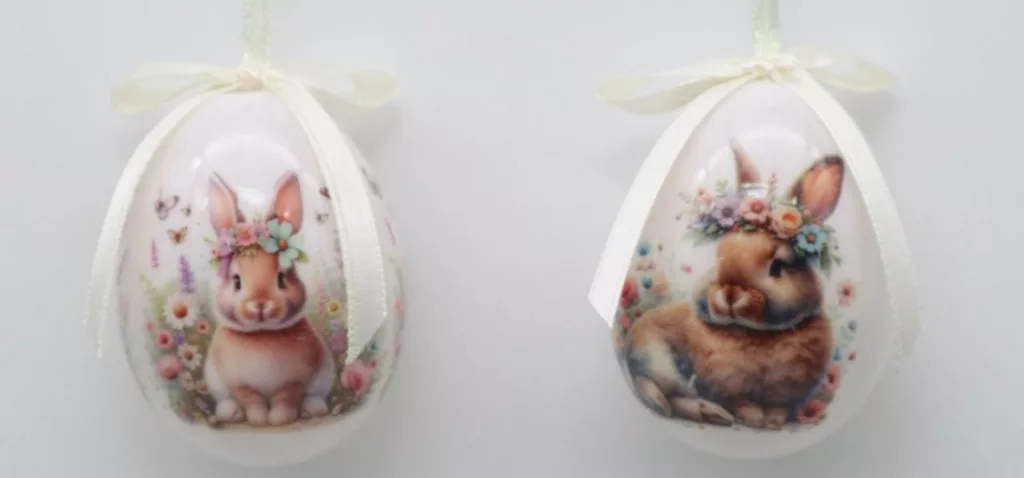 MŰANYAG AKASZTÓS TOJÁS SZETTBEN, 12 DARABOS, PLEXI DOBOZBAN, NYÚL VIRÁGKOSZORÚVAL