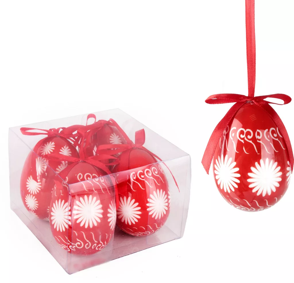 MŰANYAG AKASZTÓS TOJÁS SZETTBEN, 4 DARABOS, PLEXI DOBOZBAN, PIROS ALAPON FEHÉR VIRÁGOS